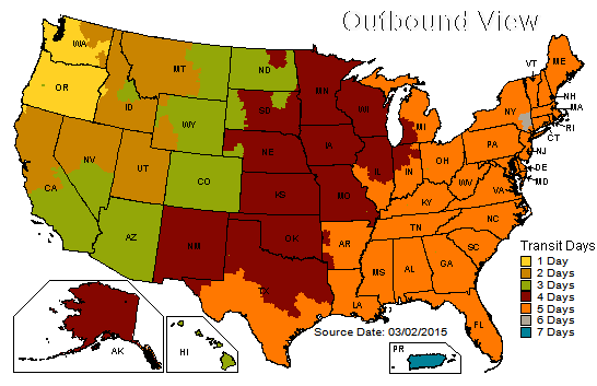 A majority of our shipments originate from Portland, OR. The map below provides an estimate of delivery times for orders shipped UPS Ground service.